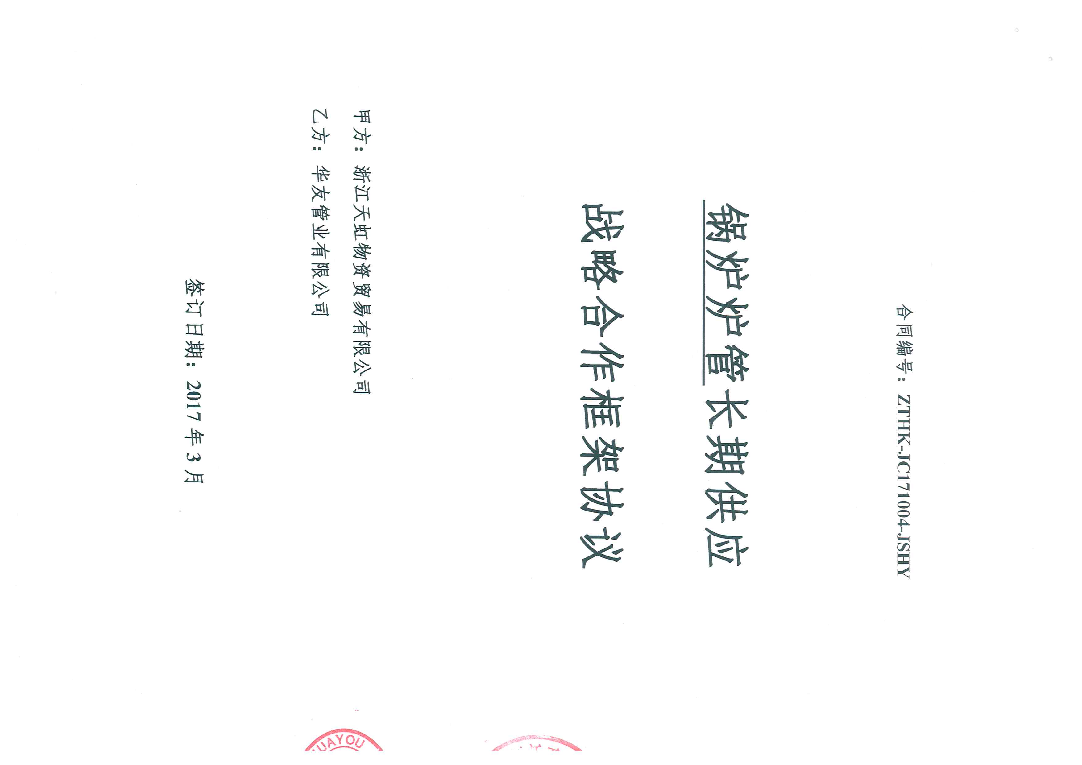 2017年4月12日 華友管業(yè)有限公司與浙江天虹物資貿(mào)易有限公司就浙能集團(tuán)爐管集約化采購事宜簽署戰(zhàn)略合作框架協(xié)議。浙江天虹物資貿(mào)易有限公司是浙能集團(tuán)下屬電廠物資的專業(yè)化采購部門,與華友管業(yè)簽訂戰(zhàn)略合作框架協(xié)議將充分利用華友的優(yōu)勢,更好地為浙能集團(tuán)各下屬電廠生產(chǎn)維...